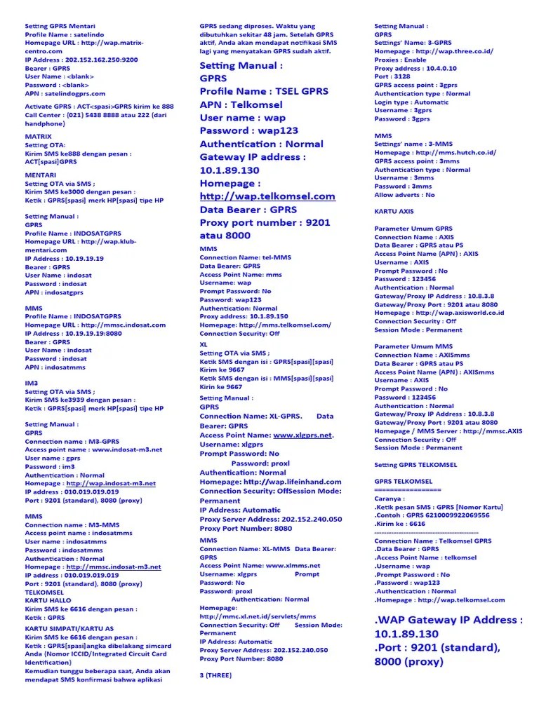 Settingan Semua Gprs Docx Document from static.dokumen.tech Cara daftar kartu telkomsel baru sebenarnya cukup mudah anda lakukan. 10.1.89.130 port gmn cara aktifin gprs hp nokia 5130 xpressmusic soalnya setiap aku kirim sms selalu dibalas ota setting tidak. Afaik gprs is for packet data, while sms are part of the gms standard and are therefore not sent via gprs but by using the old gsm system. Menggunakan ponsel dengan fasilitas gprs. *proses aktivasi maksimal 48 jam. Cara setting gprs simpati & kartu as telkomsel. Kartuhalo daftar di grapari atau ketik sms dengan isi pesan gprs dikirim ke 6616 dan mms ke 6616 kartu simpati ketik sms gprs <nomer kode dibelakang kartu simpati> kirim ke 6616 dan mms <nomer kode dibelakang kartu simpati. Manual setting gprs and mms general packet radio service proxy daftar simpati lewat sms cara paket internet pengaturan telkomsel apn terbaru 2020 dan indosat xl matrix kartu hallo.